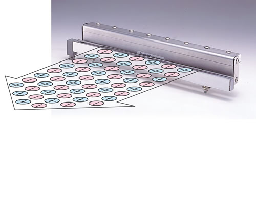 MEBで作られたイオンは、エアーナイフより吹き出される空気の層流に乗り、効率よく帯電物に運ばれ、帯電物の静電気を除去します。エアーナイフは周辺空気を巻き込んで圧搾空気を吹き出しますので風量が増幅され、遠方からの静電気除去や除塵にも効果を発揮します。